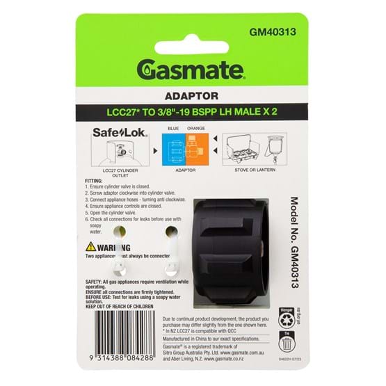Gasmate is committed to enhancing your BBQing and camping experiences with added convenience and safety. We have a comprehensive range of gas adaptors and accessories for your needs. The GM40313 Adaptor allows you to convert an LCC27 outlet to two 3/8"-19 BSPP-LH outlets.