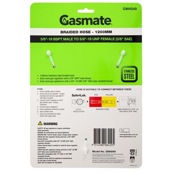 Gasmate is committed to enhancing your BBQing and camping experiences with added convenience and safety. We have a comprehensive range of gas fittings and accessories for your needs. The GM4049 1200mm Braided Hose will suit gas regulators with a 3/8” BSPT female thread and suits gas appliances with a 5/8”-18 UNF (3/8” SAE) male manifold thread.