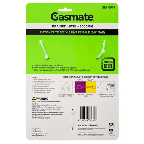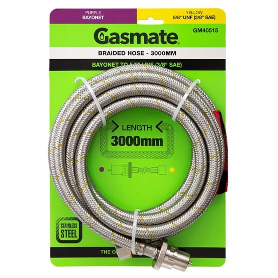 Gasmate is committed to enhancing your BBQing and camping experiences with added convenience and safety. We have a range of comprehensive gas adaptors and accessories for your needs. The GM40515 3000mm Braided Hose will suit a wall bayonet quick connect fitting and a BBQ inlet manifold with a 5/8”-18 UNF (3/8” SAE) thread.