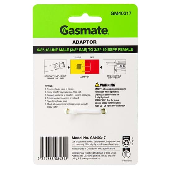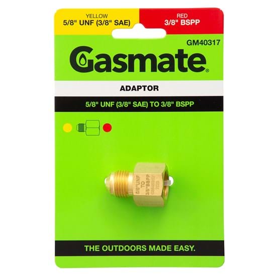 Gasmate is committed to enhancing your BBQing and camping experiences with added convenience and safety. We have a comprehensive range of gas fittings and accessories for your needs. The GM40317 Gas Fitting allows you to convert from a 5/8”-18 UNF (3/8” SAE) thread to a 3/8"-19 BSPP thread.