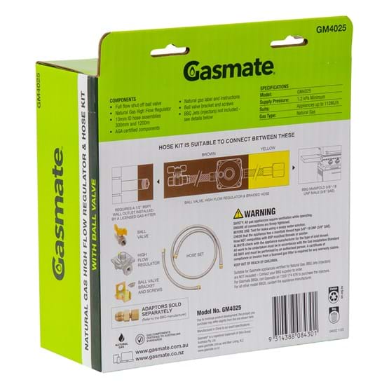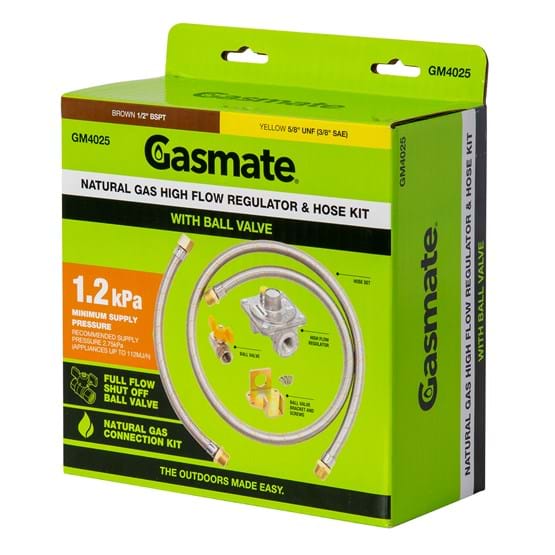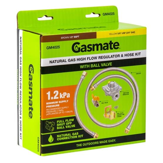 This kit is supplied complete with a regulator (1kPa), braided hose and ball valve, this kit is recommended for reticulated main gas supply pressure of at least 1.0kPa.