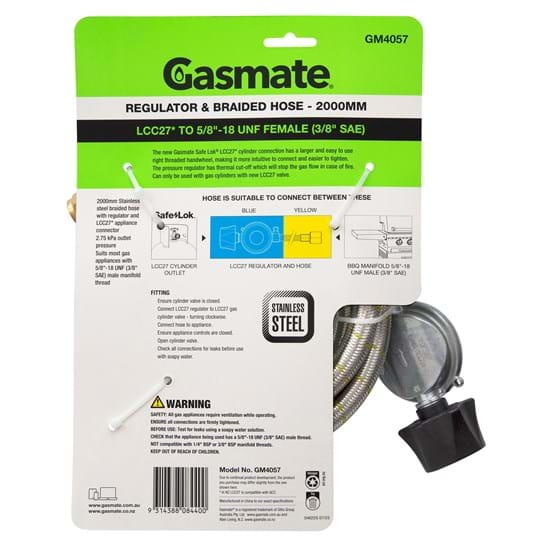 Gasmate is committed to enhancing your BBQing and camping experiences with added convenience and safety. We have a range of comprehensive gas and camping fittings for your needs. The GM4057 2000mm Regulator & Braided Hose will suit LCC27 gas cylinders and a BBQ inlet manifold with a 5/8”-18 UNF (3/8” SAE) thread.