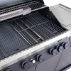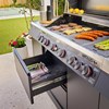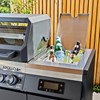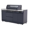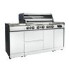 Designed for serious outdoor entertaining, the 6 burner Gasmate Apollo 6+ BBQ is available in a sleek black or white powder coated body with matching hood and contrasting black powder coated hood ends. A large glass viewing window, stainless steel fascia, durable side shelves, and a small cabinet under the right side shelf combine smart design with rugged style. The left side burner cabinet features a lift-up door that transforms into a handy shelf, while the right shelf includes a built-in ice or storage tub with a bamboo cutting board. Powered by stainless steel tube burners delivering 90.6MJ/h, it features cast iron hot plates, grill plates, a stainless steel warming rack, and precision digital control with Bluetooth/WiFi smartphone app connectivity. LED-lit knobs complete a BBQ built to perform — and built to impress.