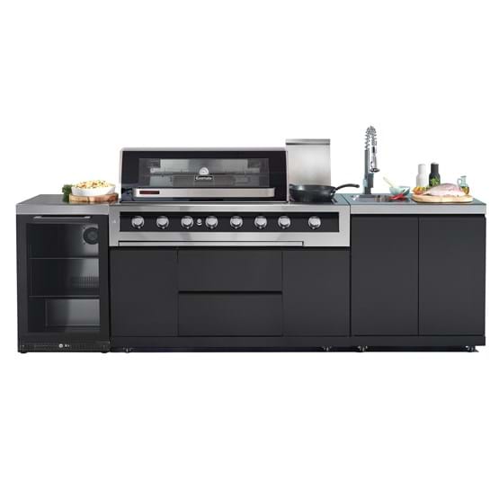 The Gasmate Galaxy Black modular outdoor BBQ kitchen features a stunning black finish for a modern elegant design. The 6 Burner BBQ features a #304 grade stainless steel hood with lustrous black finish, glass viewing window, temperature gauge and cool touch handle, enamel coated cast iron plate and grills and cast iron burners with individual electronic ignition controls.