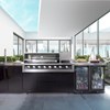 The Gasmate Galaxy Black modular outdoor BBQ kitchen features a stunning black finish for a modern elegant design. The 6 Burner BBQ features a #304 grade stainless steel hood with lustrous black finish, glass viewing window, temperature gauge and cool touch handle, enamel coated cast iron plate and grills and cast iron burners with individual electronic ignition controls.