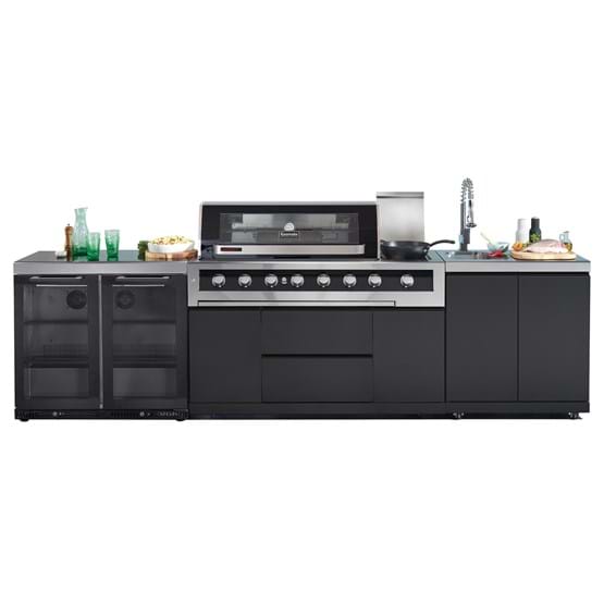The Gasmate Galaxy Black modular outdoor BBQ kitchen features a stunning black finish for a modern elegant design. The 6 Burner BBQ features a #304 grade stainless steel hood with lustrous black finish, glass viewing window, temperature gauge and cool touch handle, enamel coated cast iron plate and grills and cast iron burners with individual electronic ignition controls.