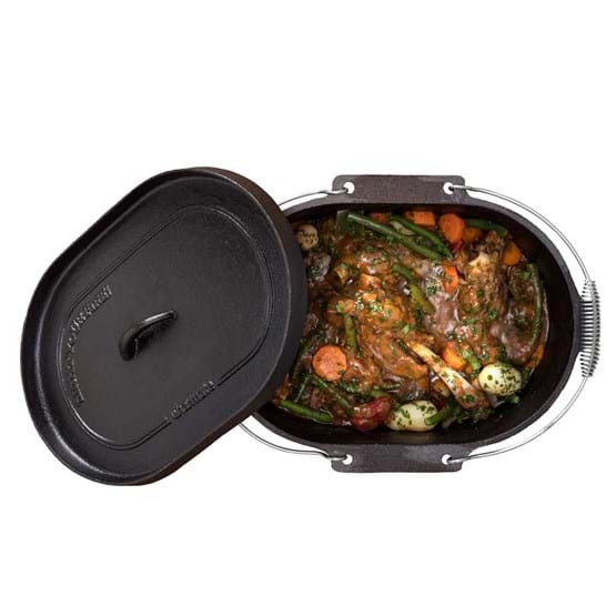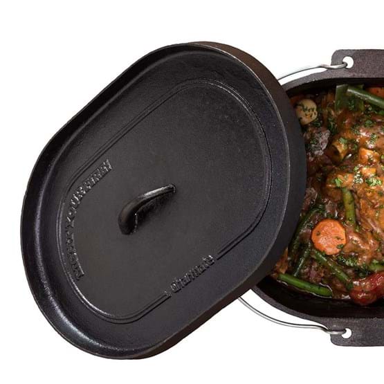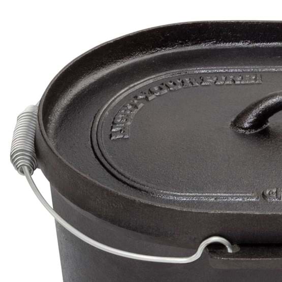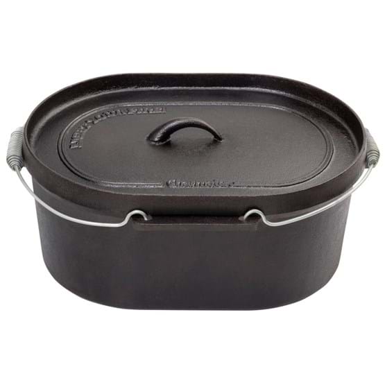 The Charmate Oval Cast Iron Camp Oven is pre-seasoned and ready for use! Its concave lid retains coals for superior heat transfer. The thick walls and base guarantee consistent heat and the wire handles are cool to touch.