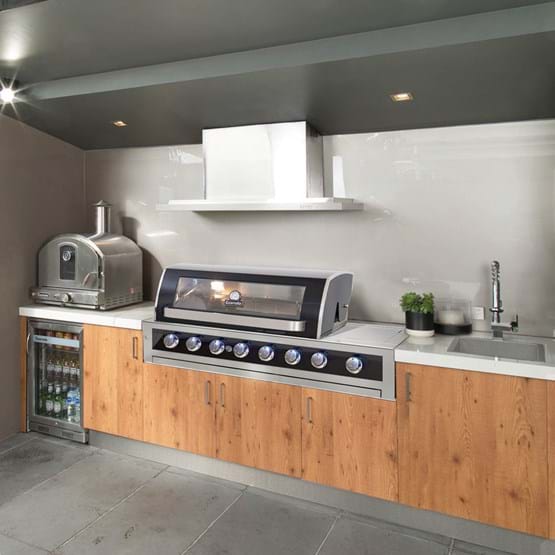 Provides an impressive 100 MJ/h high heat output, with a total of six burners, a side burner, and a rear rotisserie burner |