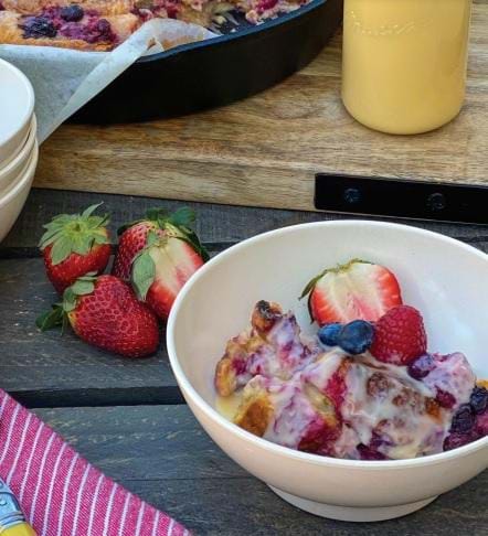 Cut the croissants in half and lightly toast on both sides on a BBQ warming rack whilst BBQ is preheating. Butter the croissants on both sides and line the dish with half of buttered croissants. Add ¾ of berries over croissants and then place remaining croissants on top.
